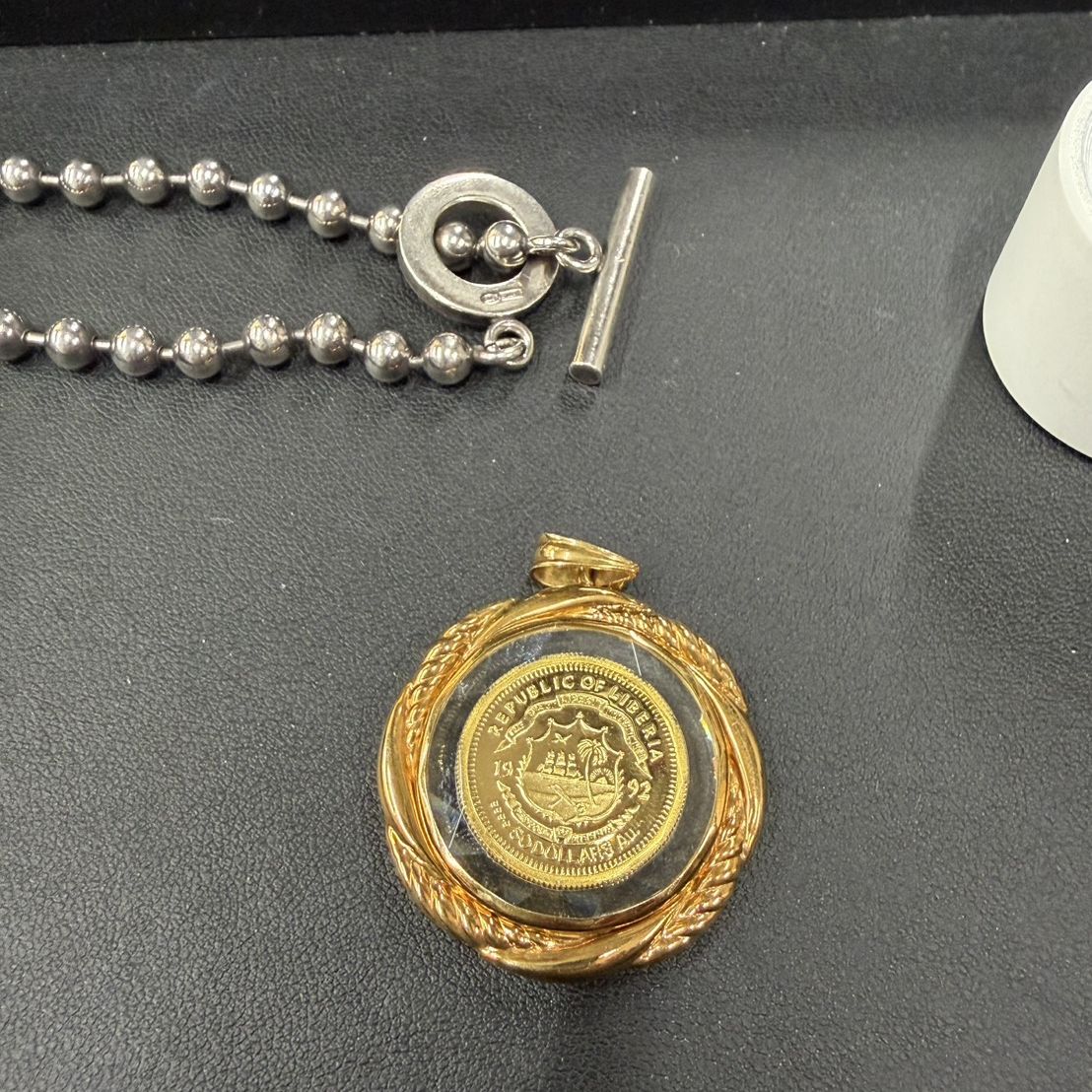 もう1点は「音速の貴公子」のニックネームが有名なアイルトン セナの50ドル金貨です。こちらはK18の枠とK24のコインの ガラス付ペンダントなります。