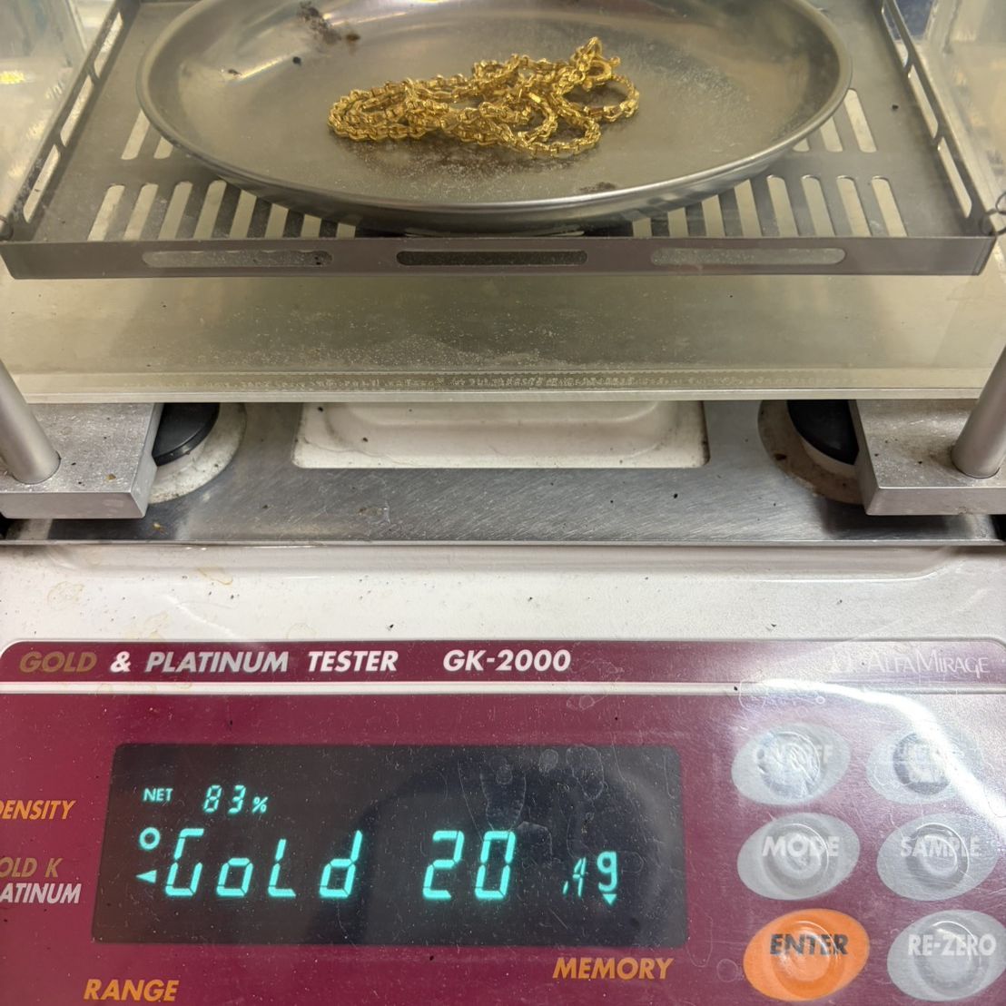 購入時はK24(純金)という事で購入されたものでしたが、色目が少し明るかったので比重計で測定したらK20でした。