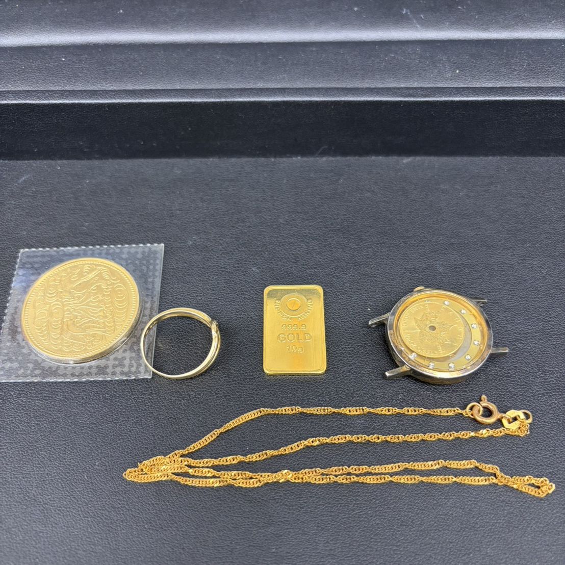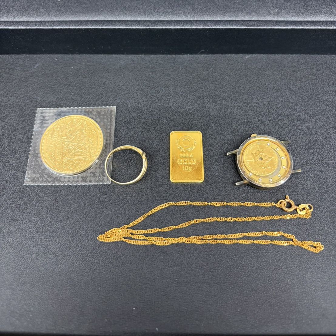 天皇陛下御在位60年記念 10万円金貨K24 10gインゴットK18 リングK18 ネックレスコインウォッチ メイプルリーフ金貨1/10オンスの5点お買取りさせて頂きました。